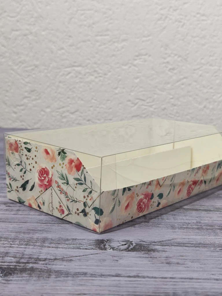Коробка для макарон с пластиковой крышкой и ложементом 21*11*5,5, розы
