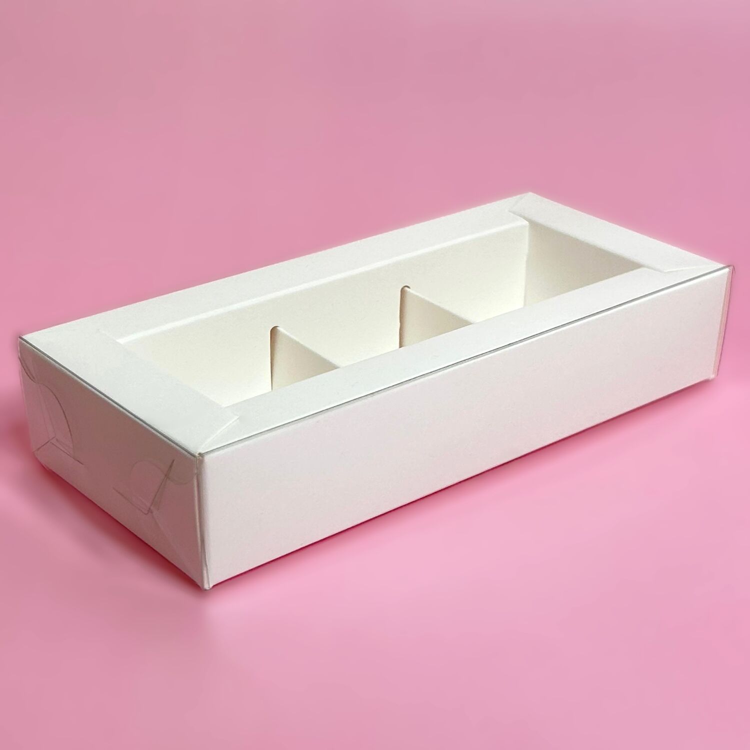 Коробка под 3 конфеты с пластиковой крышкой 15,5*7*3 белая